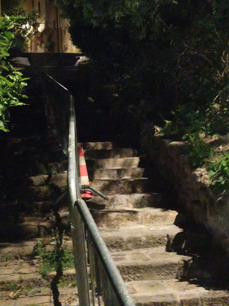 Voglio segnalare all'Amministrazione la pericolosità che si è venuta a creare nel tratto non ultimato dei lavori iniziato alcuni mesi fasulle scale di Via Ripetta. Ciò è dovuto sia alla transennatura che specialmente di notte trovandosi in zona poco illuminata in quanto il cipresso posto in angolo tra via Ripetta e le scale che vanno a piazzetta Avelli, crea un cono di ombra chr non permette una adeguata illuminazione del tratto sopra descritto.Allego file per una maggior chiarezza cira la segnalazione inoltrata.