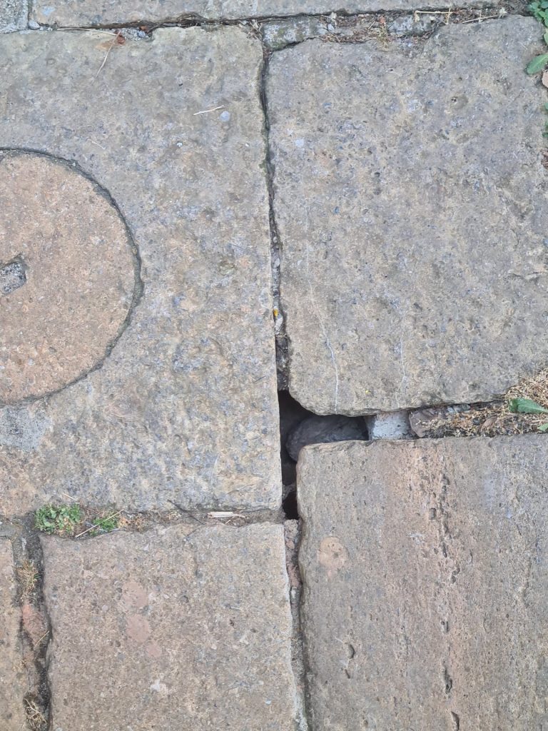 Vicino ad un tombino, in Vicolo dei Ciliegini tra i numeri civici 8 e 10, si è verificato un allargamento tra le bozze e si nota del vuoto sottostante. Pertanto si ritiene opportuno che venga eseguita una verifica. Si allega la relativa foto.