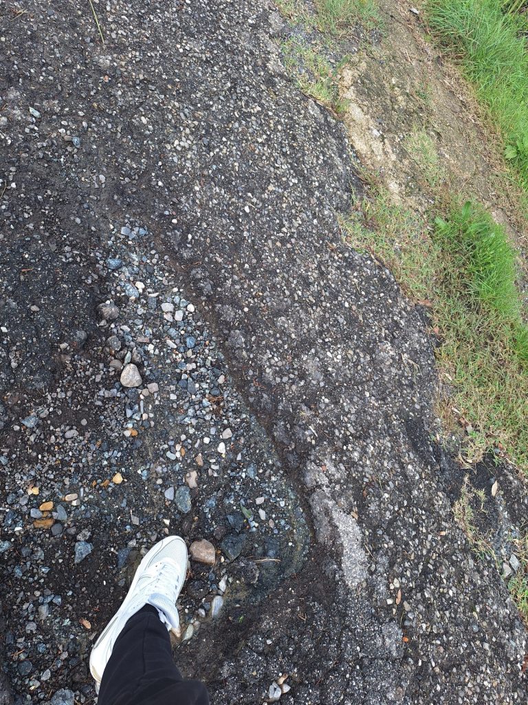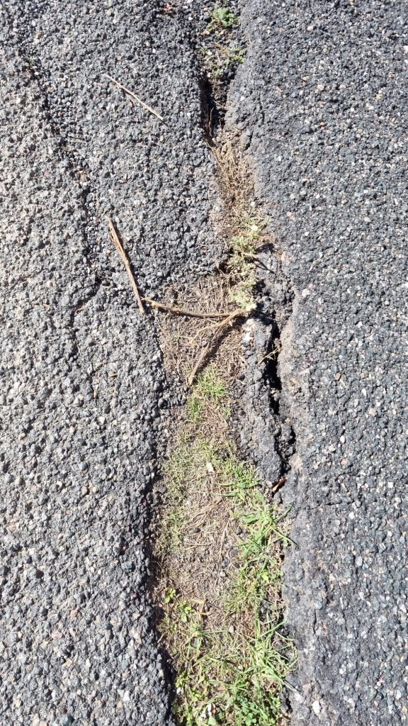 la strada, soprattutto nella sua parte finale, risulta visibilmente danneggiata e in alcuni punti su due livelli di alcuni cm, inoltre risulta quasi totalmente vuota al disotto e tenuta "stabilie" quasi esclusivamente dal cordolo di supporto in cemento.
